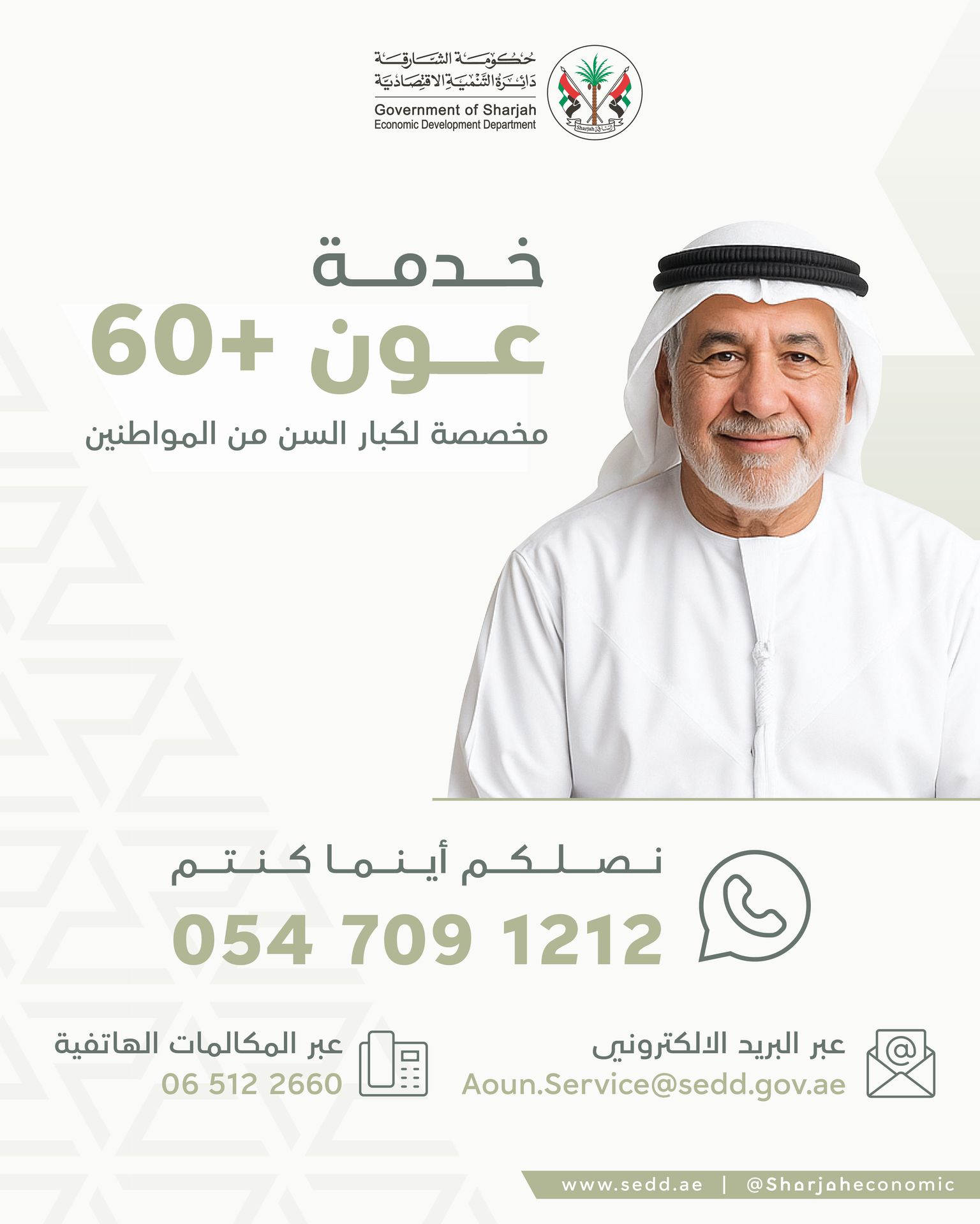 Sharjah Economic Development Department announced the launch of a new service called (Awn 60+), dedicated to senior citizens aged 60 and above. This service aims at facilitating the access of senior citizens to the Department’s services without the need to visit its headquarters, and through simple steps via WhatsApp on the number: 0547091212 or through the landline 065122660.